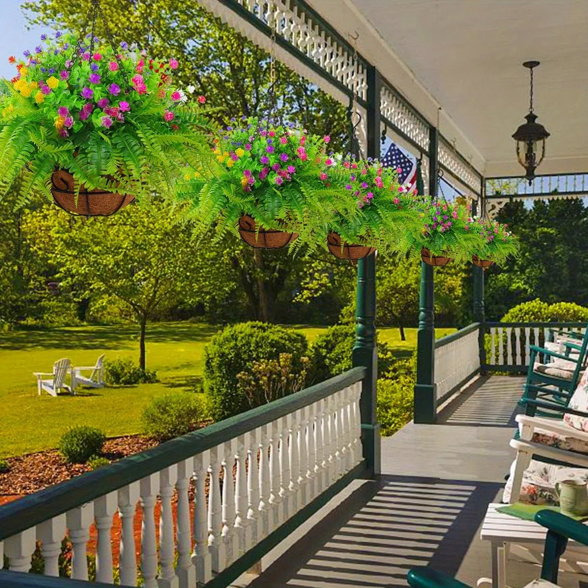 Uv Resistant hanging flower baskets to dress up your porch or patio with vibrant color and charm.