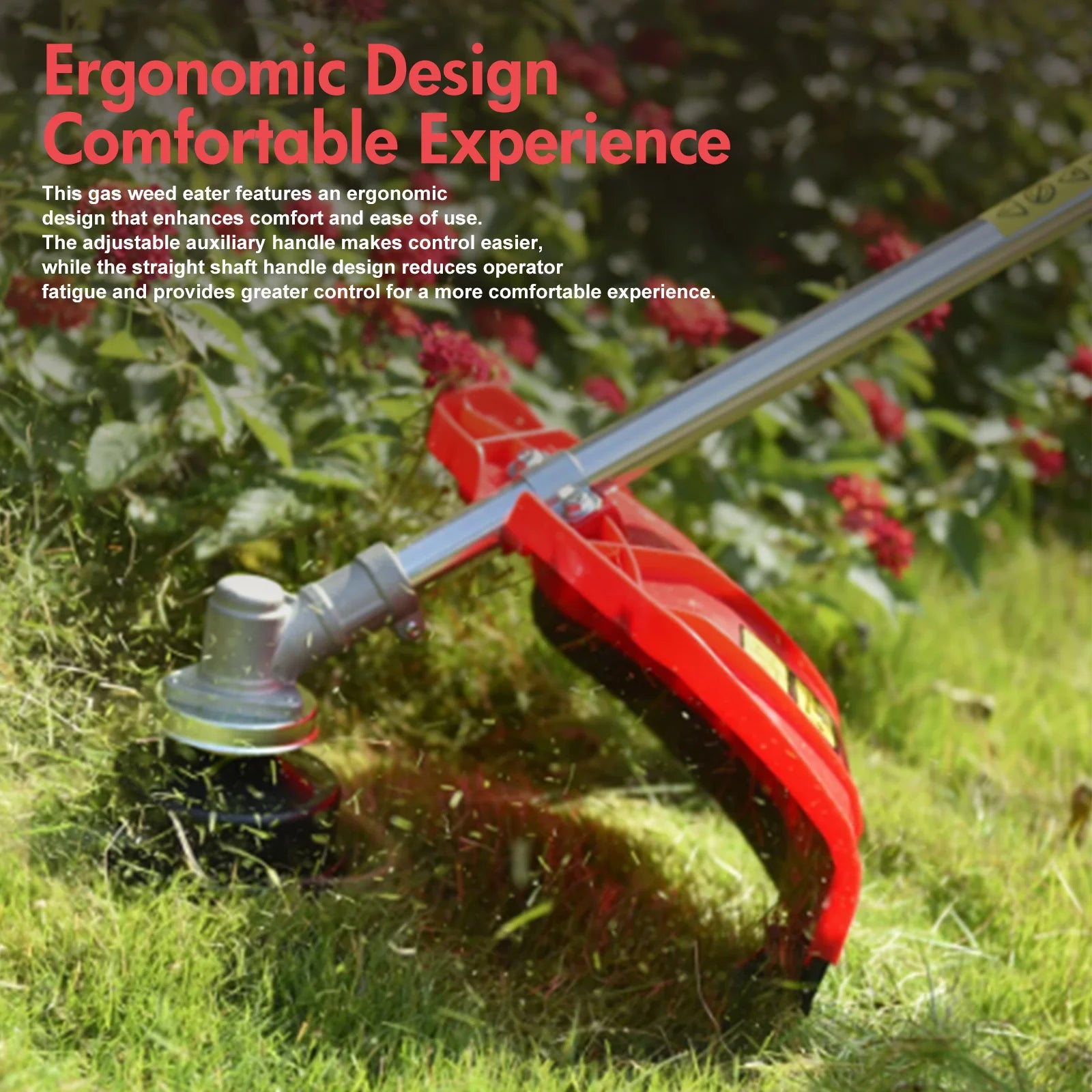 This gas weed eater combines powerful performance, versatility, efficient operation, safe usage, and a comfortable experience. The 4-stroke engine easily handles dense vegetation, and the 2-in-1 design allows for both trimming and edging with one machine. With a 16-inch wide cutting swath and straight shaft design, trimming is more efficient and thorough. The easy-to-remove baffle and cordless design ensure safe operation. The ergonomic design provides ease of use and reduces fatigue. The telescoping shaft is easy to store and takes up minimal space. Whether for home gardens or lawn maintenance, this weed eater is your ideal choice.
