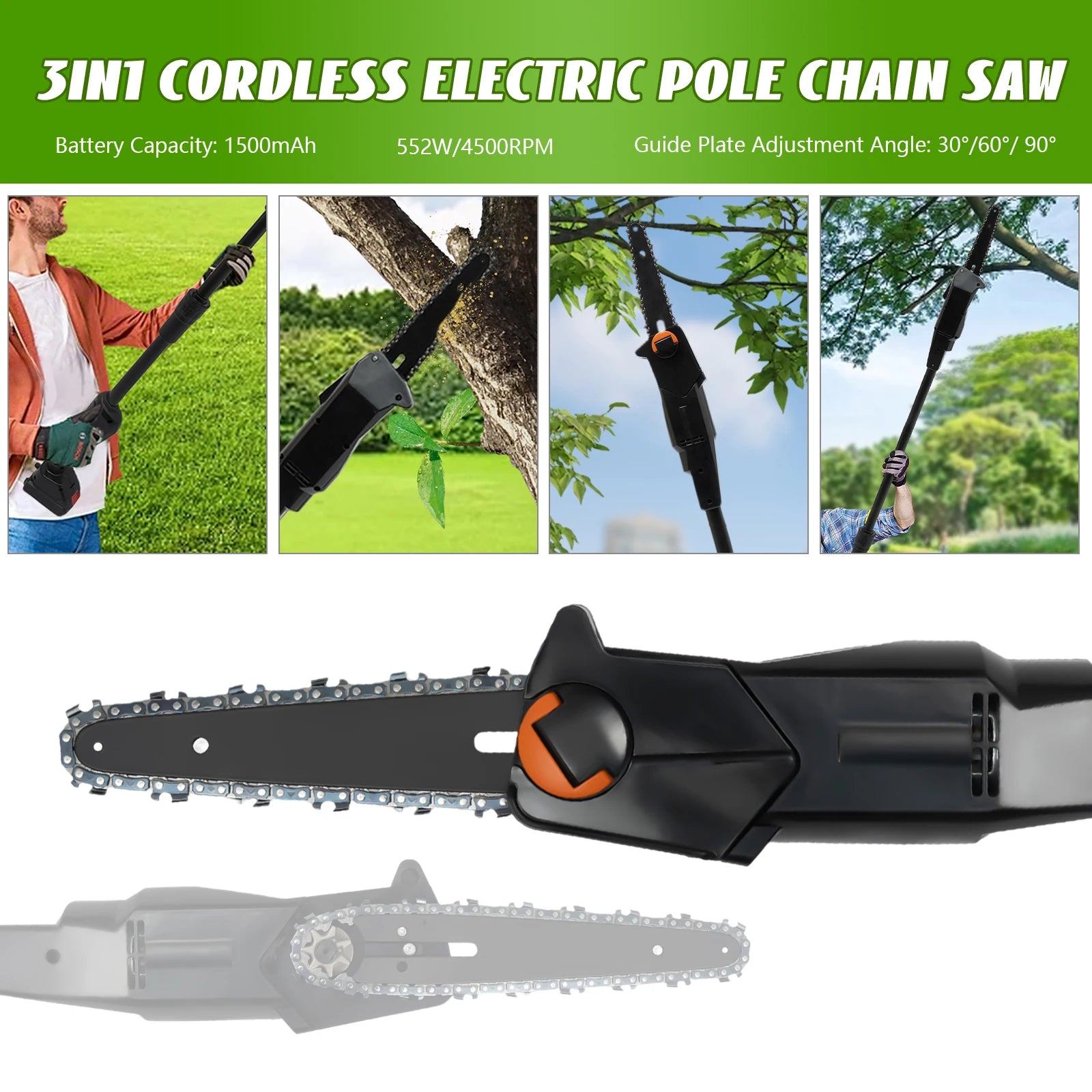 This pole saw is made of high-quality manganese steel saw chain, alloy carbon steel blade, and ABS for long life. The safety lock design can provide you with a higher level of security. The cordless design eliminates the difficulty of jack wiring and the limitation of work caused by tangled wires. It will be your powerful working assistant!